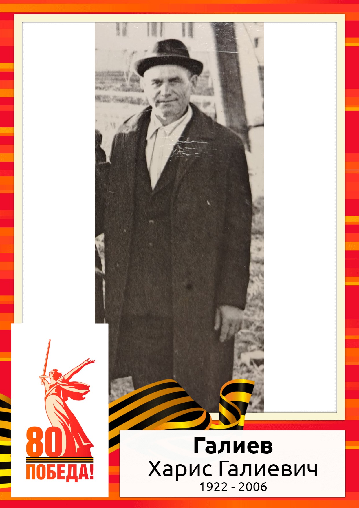 ![]() Победа в войне часто добывается не навыками и технической мощью, а усилиями людей, до наступления врага ни разу не державших в руках оружие. Благодаря своему героизму простые выходцы из деревень, ставились героями Великой Отечественной войны. Мой дедушка со стороны отца Галиев Харис Галиевич, 22 апреля 1922 года рождения. Родился в д. Верхний Тимерлек Кзыл-Юлдузского района Татарской АССР. На войну призывался в декабре 1941 года через Молотовский РВК. Присвоено воинское звание младший сержант, автоматчик. Проходил службу в 118 отдельном пулеметном артиллерийском батальоне, дослужился до командира пулеметного отделения. После победы участвовал в боевых действиях во Владивостоке. Награжден медалями «За Победу над Германией», «За боевые заслуги». Осенью в 1945 году вернулся в родную деревню. Харис бабай вместе с нашей бабушкой Шамсекамал Хановной родили и воспитали 8 детей. Харис бабай всю жизнь проработал во благо своего родного края, в колхозе имени Г.Тукая. После выхода на заслуженный отдых он многие годы был имамом в родной деревне. Умер 06 января 2006 года. Особые слова благодарности — тем, кто бережно хранит семейные истории и передаёт их молодому поколению. Ваша память — наш общий щит против забвения. Историю своей семьи рассказала нам помощник судьи Галиева Г.Р.